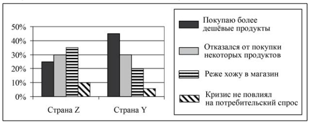 Учёные, анализируя данные социологических опросов в странах Z и Y, изучали потребительское поведение жителей в условиях экономического кризиса. На диаграмме приведены данные (в % от числа отвечавших) о том, как в течение года изменился потребительский спрос.