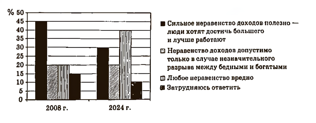 В ходе социологических опросов совершеннолетним гражданам предложили определить своё отношение к проблеме социального неравенства. Полученные результаты (в % от числа опрошенных) представлены в графическом виде.