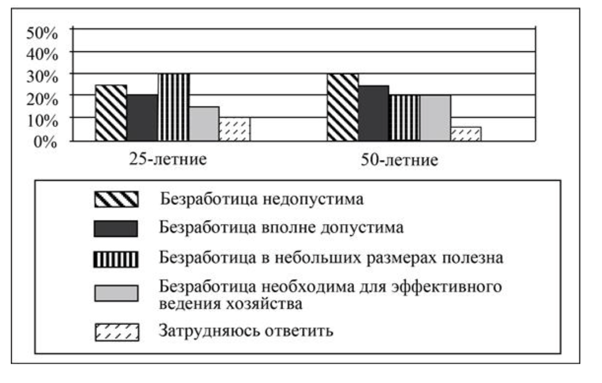 В ходе социологических опросов 25-летним и 50-летним гражданам предлагали высказать своё мнение о безработице. Полученные результаты (в % от числа опрошенных) представлены в графическом виде.
