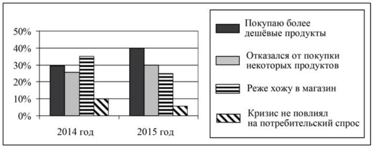 Учёные, анализируя данные социологических опросов, изучали потребительское поведение жителей страны N в условиях экономического кризиса. На диаграмме приведены данные (в % от числа отвечавших) о том, как в течение года изменился потребительский спрос.