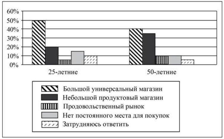 В ходе социологического опроса 25-летних и 50-летних граждан страны M им задавали вопрос: «Где Вы обычно покупаете продукты питания?» Результаты опроса (в % от числа отвечавших) приведены на диаграмме.