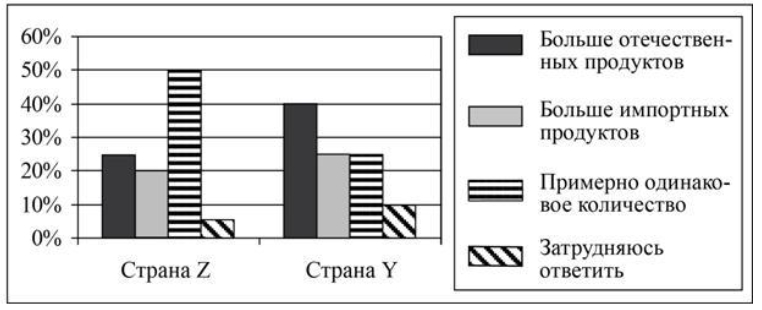 В ходе социологических опросов совершеннолетних жителей стран Z и Y им предложили сравнить количество отечественных и импортных продуктов в магазинах в их населённых пунктах. Результаты опросов (в % от числа отвечавших) приведены на диаграмме.