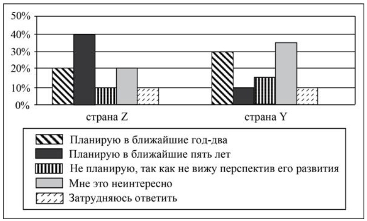 В ходе социологических опросов совершеннолетних граждан стран Z и Y им был задан вопрос: «Планируете ли Вы открыть (создать) собственный бизнес?». Результаты опросов (в % от числа отвечавших) приведены в диаграмме.