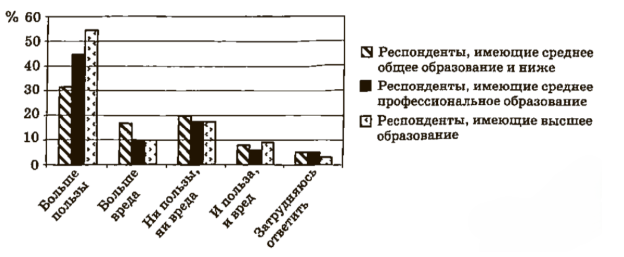 В ходе социологического опроса совершеннолетним россиянам, имеющим разный уровень образования, задавали вопрос: «Как Вам кажется, в целом от споров людей на общие темы больше пользы или больше вреда?» Полученные результаты (в % от числа опрошенных) представлены в графическом виде.