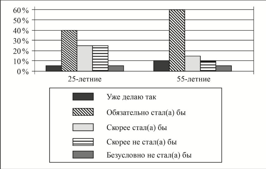 В ходе социологического опроса 25-летних и 55-летних граждан им был задан вопрос: «Один из экологически целесообразных способов переработки мусора предполагает сортировку бытовых отходов. Если бы у Вас была возможность выбрасывать каждый вид мусора в отдельный контейнер, стали бы Вы сортировать Ваш мусор?»