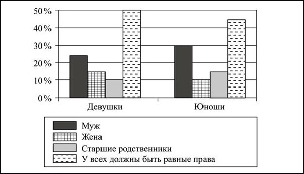 В ходе социологического опроса группы совершеннолетних юношей и девушек государства Z им задавали вопрос: «Кто должен быть главой семьи?» Полученные результаты (в % от числа опрошенных) представлены в виде диаграммы.
