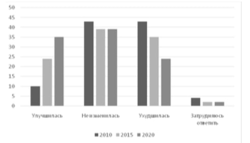 В ходе социологических опросов совершеннолетние граждане страны Z высказали мнение об экологической обстановке в месте своего проживания. Полученные результаты (в % от числа опрошенных, каждый год опрашивали одинаковое количество граждан) представлены в виде диаграммы.