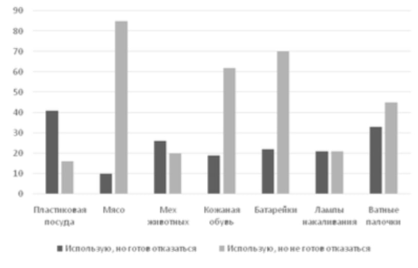 В ходе социологического опроса об экологичном потреблении совершен- нолетние граждане страны Z ответили на вопрос «От каких неэкологичных товаров Вы готовы отказаться, а от каких отказаться не готовы?». Полученные результаты (в % от числа опрошенных) представлены в виде диаграммы.
