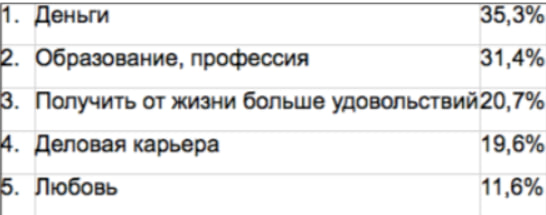 Интернет-изданием был проведён опрос среди молодых людей крупных городов страны Z на тему: «Распределение основных ценностей молодых людей». Полученные результаты (в % от числа опрошенных) представлены в таблице.