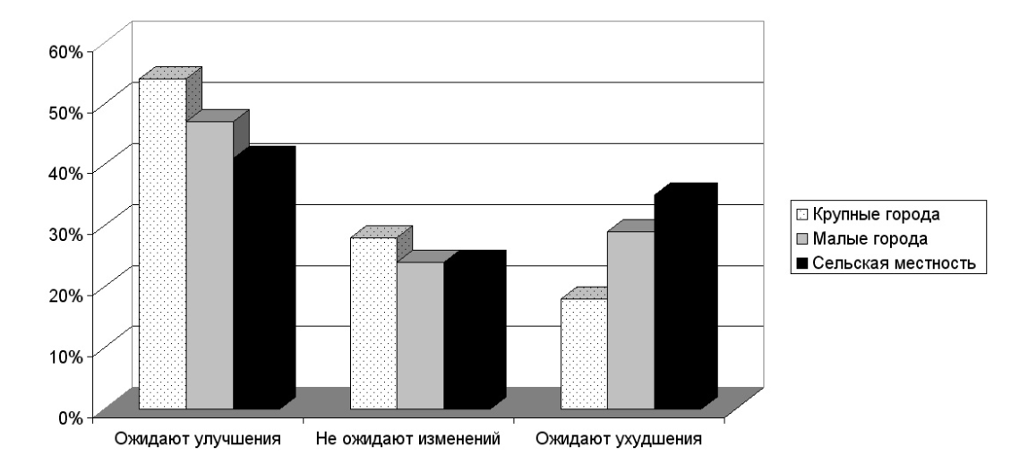 Среди разных возрастных категорий населения страны N был проведён социологический опрос на тему: «Ожидаете ли Вы улучшения своего материального положения в течение ближайших пяти лет?» Его результаты отражены на диаграмме.