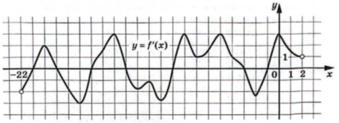 На рисунке изображён график y=f′(x) - производной функции f(x), определённой на интервале (−22; 2). Найдите количество точек минимума функции f(x), принадлежащих отрезку [-18; 1].