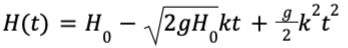 В боковой стенке высокого цилиндрического бака у самого дна закреплён кран. После его открытия вода начинает вытекать из бака, при этом высота столба воды в нем, выраженная в метрах, меняется по закону , где t - время в секундах, прошедшее с момента открытия крана, H0 = 5 м - начальная высота столба воды, k = 1/700 - отношение площадей поперечных сечений крана и бака, а g - ускорение свободного падения (считайте g = 10 м/с2). Через сколько секунд после открытия крана в баке останется четверть первоначального объёма воды?
