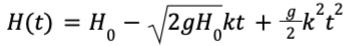 В боковой стенке высокого цилиндрического бака у самого дна закреплён кран. После его открытия вода начинает вытекать из бака, при этом высота столба воды в нем, выраженная в метрах, меняется по закону , где t - время в секундах, прошедшее с момента открытия крана, H0=20 м - начальная высота столба воды, k=1/200 - отношение площадей поперечных сечений крана и бака, а g - ускорение свободного падения (считайте g=10 м/с2). Через сколько секунд после открытия крана в баке останется четверть первоначального объёма воды?