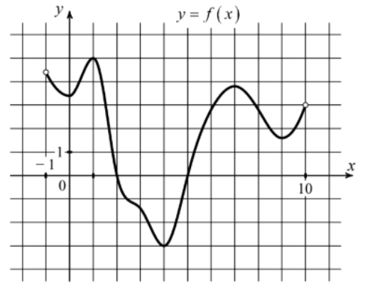 На рисунке изображён график функции y=f(x), определённой на интервале (-1;10). Определите количество точек, в которых производная функции f(x) равна 0.